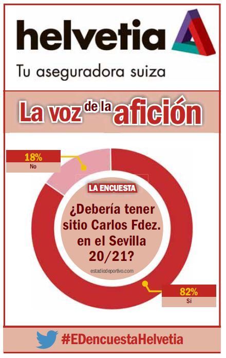 En su habitual encuesta diaria, ESTADIO Deportivo pulsaba en el día de ayer la opinión de la aficion sevilistas en torno al futuro del delantero Carlos Fernández y con una pregunta muy clara: ¿Debería tener sitio Carlos Fernández en el Sevilla FC de la temporada 20/21? Y la respuesta ha sido casi unánime. El canterano sevillista se ha ganado un puesto un puesto en la plantilla de Julen Lopetegui. Así se reflejaba al cierre de la edición impresa de ED, con hasta un contundente 82% de síes y un 18% de noes.