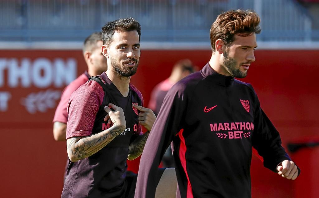 Suso, junto a Franco Vázquez, en el entrenamiento del Sevilla.R.S.
