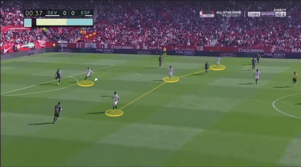 El Sevilla FC forma de inicio con un 4-3-3 que transformarse sin balón en 42-3-1, para tapar los pasillos centrales y acosar tanto al pivote como a los laterales contrarios para que sus centrales se vean obligados a dar un patadón largo, en los que suelen imponerse Diego Carlos y un Jules Koundé que, pese a no ser alto, posee un gran salto.