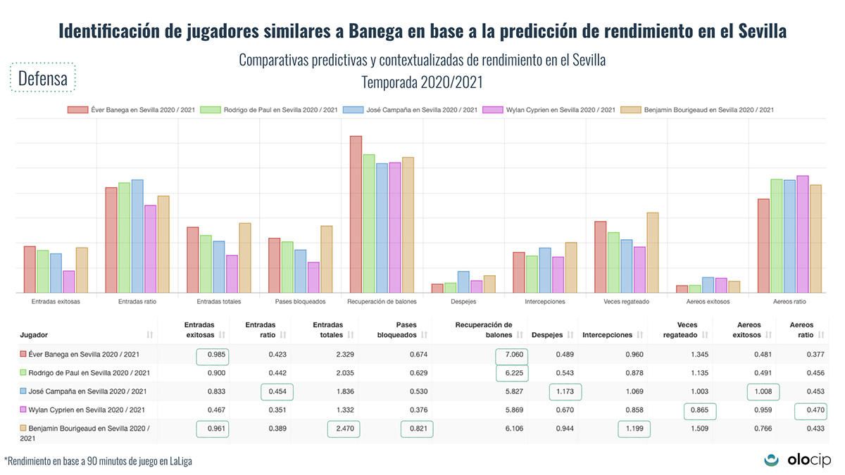 Para la identificación de los jugadores similares a Éver Banega en el Sevilla FC del futuro, Olocip utiliza una serie de criterios: búsqueda de similares en base al rendimiento en el equipo de destino (Sevilla), y no en el de origen; la capacidad de jugar en la misma posición y tener un rol similar a Banega; un número de minutos jugados superior a 1.000' en la presente temporada; un máximo de edad de 27 años; su situación actual en el mercado; un valor de mercado adaptado a las recientes inversiones económicas del Sevilla FC y una serie de variables representativas que irían en relación a las variables descriptivas más destacadas del '10' sevillista en las últimas tres temporadas (asistencias, centros, verticalidad de pases, regates totales, entradas exitosas, recuperaciones de balón, pases totales, pases frontales, construcción de juego, cambios de juego€)