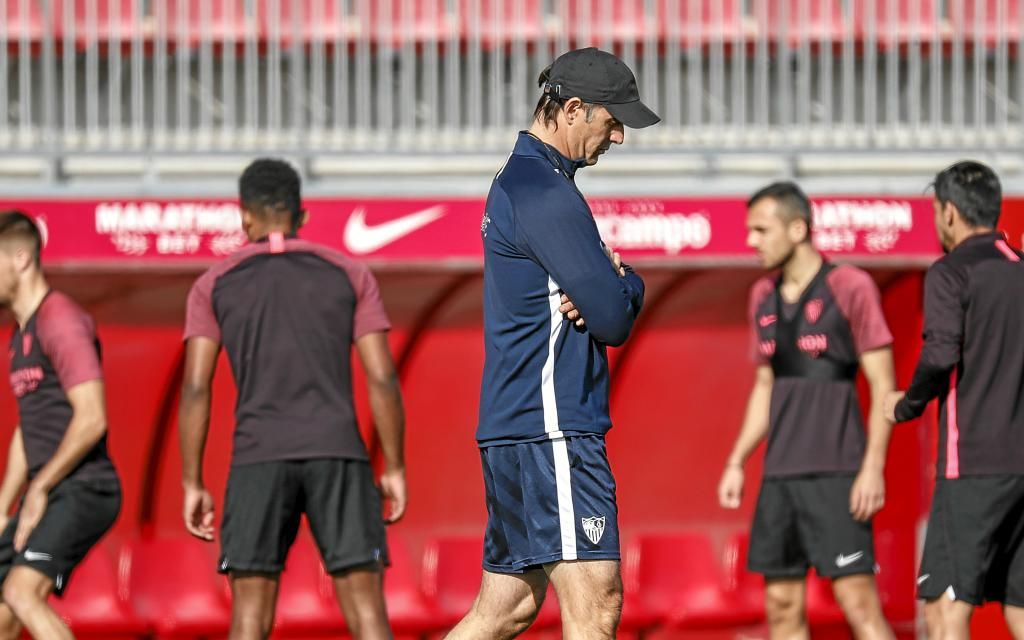 Lopetegui, pensativo, en un entrenamiento del Sevilla.F. Ruiz