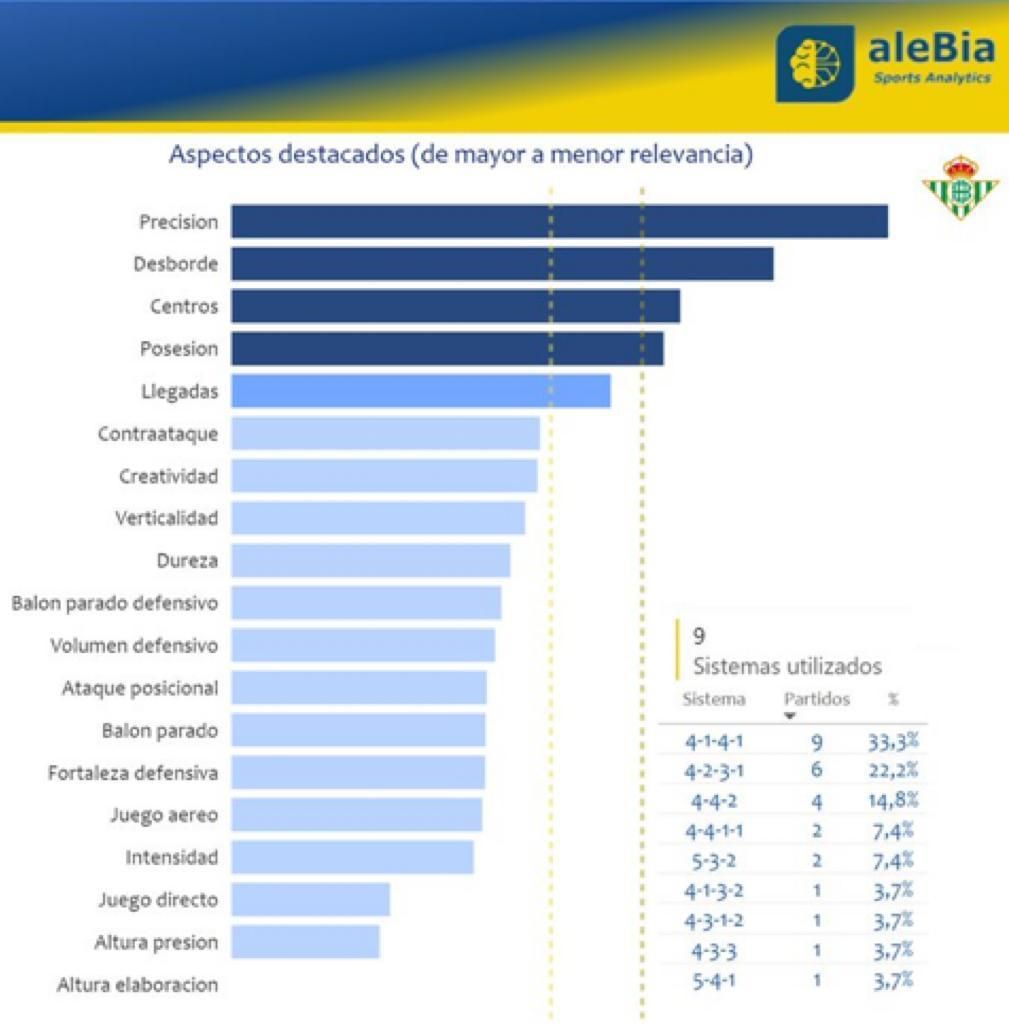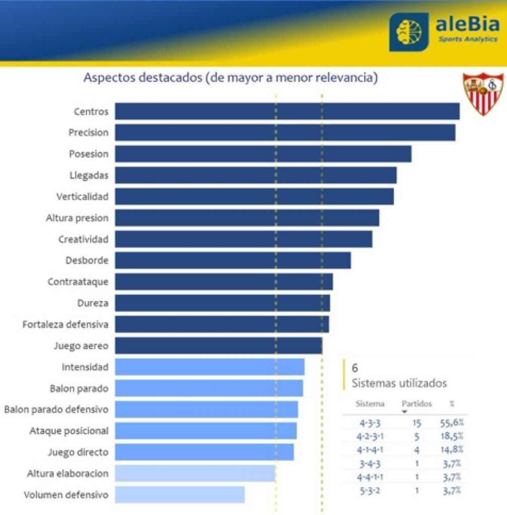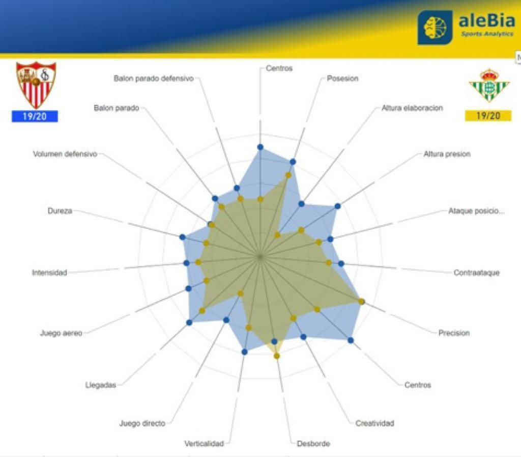 El Big Data muestran dos equipos de perfil muy diferentes, con puntos fuertes distintos y maneras alejadas de entender el fútbol. No sorprende que la variable en la que más destaque el Sevilla sea la de los centros, la vía preferida para crear peligro, ni que la posesión se encuentre en el podio de fortaleza. En cambio, la creatividad carece de protagonismo, al igual que el desborde, por debajo de conceptos como la altura de presión , todo lo contrario que el Betis, donde es valor puntero.