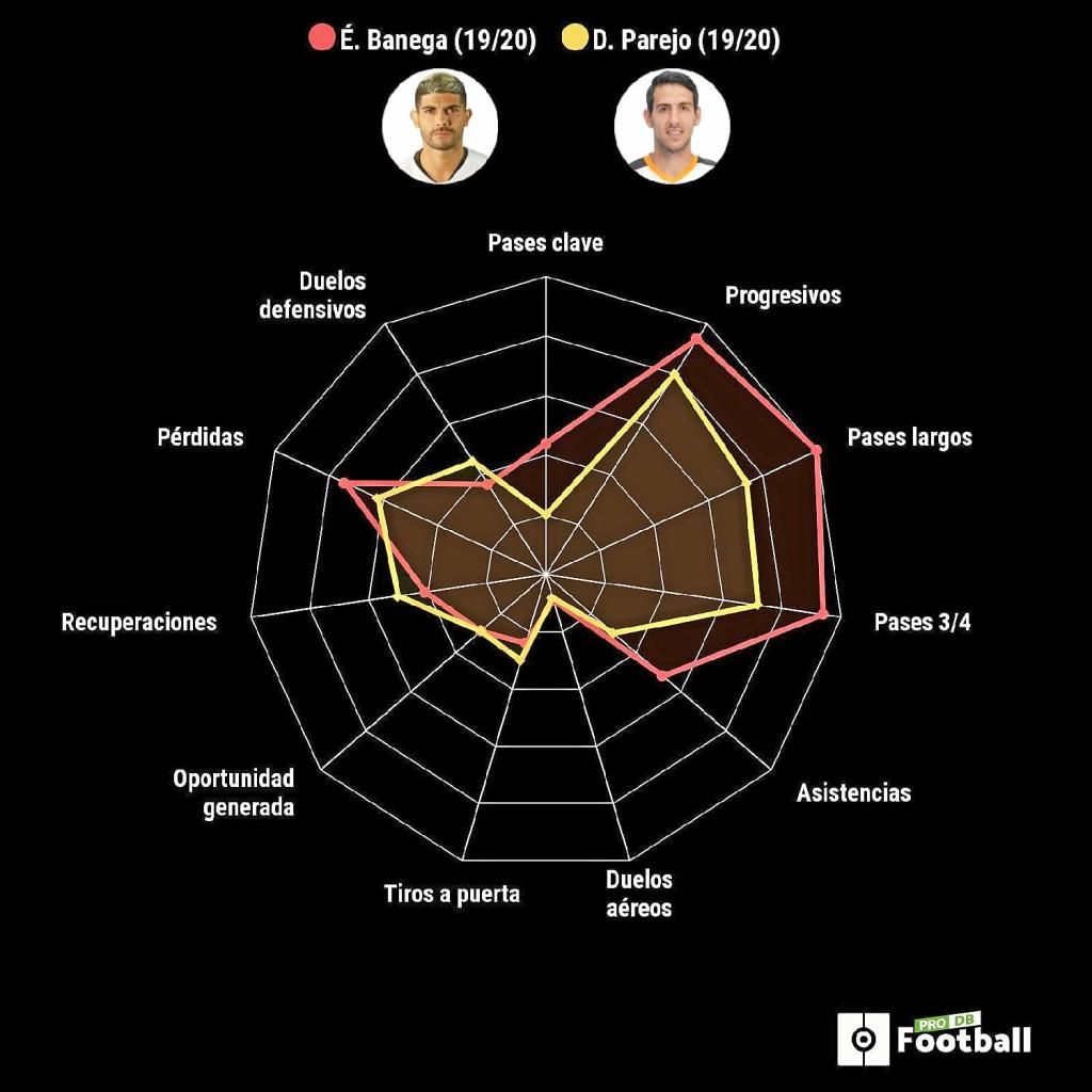 Para ello, será de gran utilidad el gráfico realizado por @ProFootballDB, en el que se puede apreciar rápidamente los picos en los que sobresale cada uno y también el dominio de Banega en más apartados, sobre todo en los referidos a los pases, en los que supera con creces a Parejo, tanto en pases clave, como progresivos, largos y en 3/4, y también en asistencias. La mayor distancia se atisba en los desplazamientos largos y en los claves, incluidas asistencias, lo que ha convertido a Banega en más decisivo esta temporada pese a no ser la mejor en su etapa como nervionense.