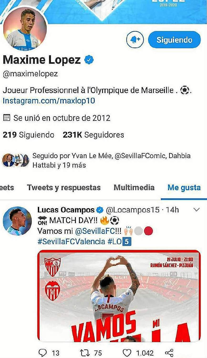 Maxime López no esconde su predilección por el Sevilla y mientras que en Marsella aseguran que su fichaje está "casi hecho" por el Sevilla, él realiza guiños continuos a los nervionenses a través de sus redes sociales.