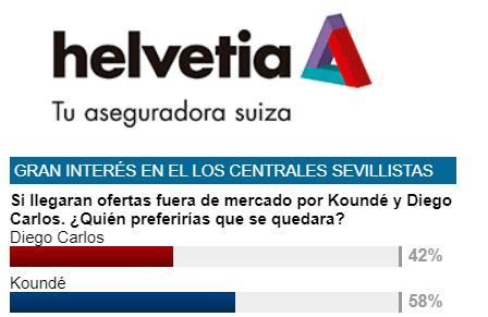 Un 58 por ciento de los votantes se posicionó a favor de amarrar a Koundé, que les ha conquistado por su elegancia no exenta de batalla y su versatilidad para jugar también en banda, frente a un nada despreciable 42 por ciento que considera que sería más difícil sustituir a Diego Carlos, que se ha destapado como un muro infranqueable tanto en las alturas como a ras de césped y que ha exhibido un sobresaliente desplazamiento en largo.