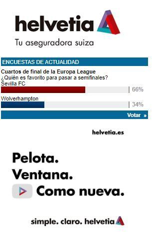En nuestra 'Encuesta Helvetia' preguntábamos: ¿Quién es favorito para pasar a semifinales? Y aunque el Sevilla ha salido victorioso ni mucho mucho menos lo es por goleada. Muchos sevillistas no venden la piel de los 'lobos' antes de cazarla, por ello, hasta un 34% de los votantes ven como favoritos a los ingleses.