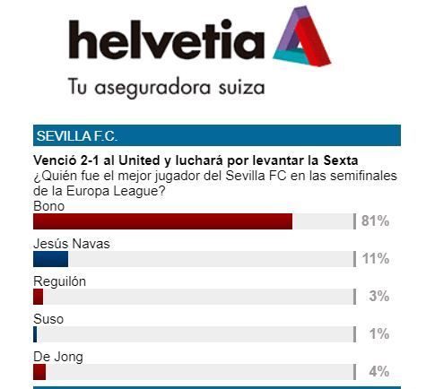 El marroquí ha arrasado en la #EncuestaHelvetiaED propuesta por el portal web de este periódico para conocer quién había sido el mejor de la vibrante semifinal de la Europa League ante el United, a juicio de los aficionados. No hay el más mínimo debate: Bono ha recibido un abrumador 81 por ciento de los votos, frente a un 11% para Jesús Navas, asistente en el 2-1 de un De Jong que se lleva el 3% de los votos. Un 4% de los participantes escogió a Reguilón, clave para la reacción nervionense con su gran servicio a Suso (1%) en el momentáneo 1-1.