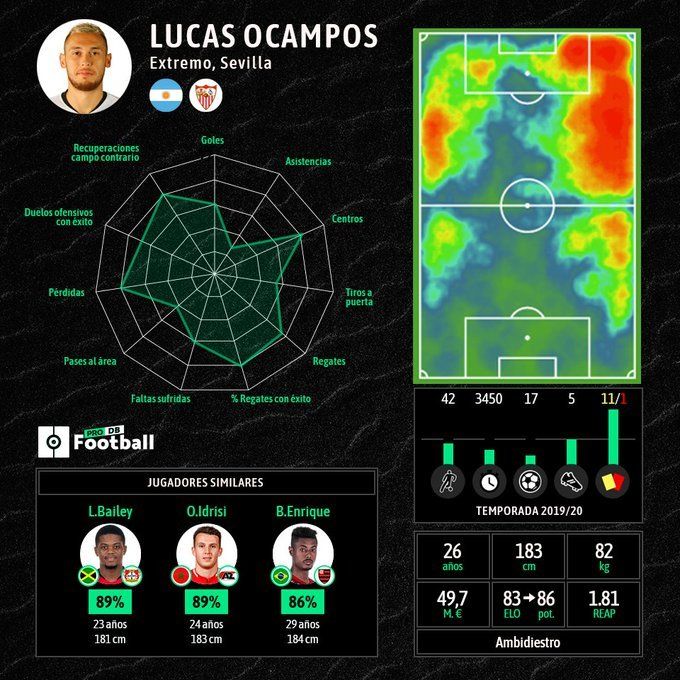 Normal que las cada día más recurrentes bases de datos -el Big Data, la Inteligencia Artificial...- se afanen en encontrar al próximo Ocampos, un jugador muy codiciado por lo completo que le hacen sus características. Además de goles y asistencias, aporta capacidad de desborde, una letal zancada para correr al espacio libre, juego aéreo y un carácter indomable que le hace ir al cien por cien en todas las jugadas, liderando la presión alta, recuperando en campo contrario, además de mostrar compromiso en los balones divididos y en las ayudas a su lateral.