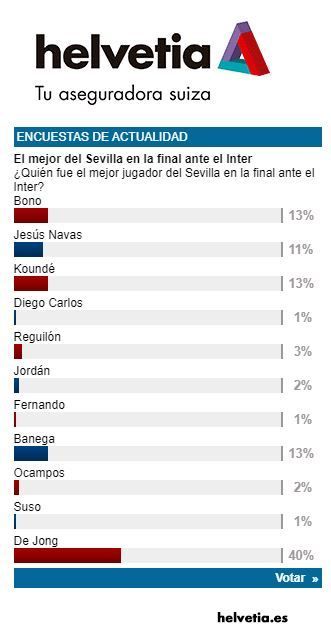 Un nombramiento que también suscribe la afición sevillista en nuestra 'Encuesta Helvetia' lanzada a la finalización del partido. ¿Quién fue el mejor jugador del Sevilla en la final ante el Inter? Tras cosechar la sexta Europa League en un partido épico, desde ED dimos a elegir entre todos los jugadores del once inicial y el ganador, sin duda alguna, es De Jong.
