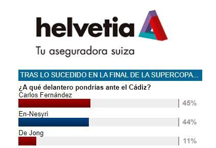 El canterano ha recibido el apoyo de un 45 por ciento de los votantes en la #EncuestaHelvetiaED, que preguntaba a los lectores de ESTADIO Deportivo quién debería ser el '9' titular de Lopetegui en el choque ante el cuadro gaditano. El resultado del sondeo no ha podido ser más apretado, pues Carlos Fernández sólo aventaja en un punto porcentual el 44% de respaldo con el que cuenta En-Nesyri, que acabó abatido la Supercopa de Europa y no para de darle vueltas a esa acción que pudo darles el triunfo.