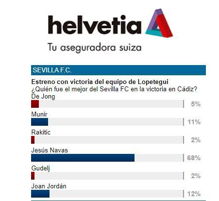 Así, no es de extrañar que el palaciego haya arrasado en la #EncuestaHelvetiaED en la que este periódico preguntaba a los lectores quién había sido el mejor del encuentro entre el Cádiz y el Sevilla. Navas se llevó un 66 por ciento de los votos; seguido de Joan Jordán, con un 12%, y del decisivo Munir, opción escogida por un 11% de los participantes. De Jong fue la opción marcada por un 5% y cierran la lista el croata Rakitic y el serbio Nemanja Gudelj, con un 2% cada uno.
