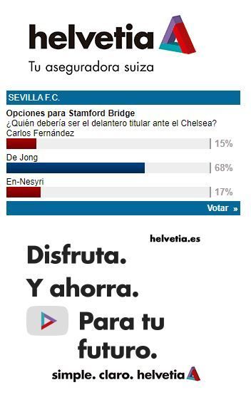Por detrás, muy lejos como segunda y tercera opción quedan En-Nesyri, con el 17% de los votos, y Carlos Fernández, con el 15%, siendo muy probable que alguno de los dos, quién sabe si los dos en función de cómo transcurra el partido, tenga minutos en la segunda parte frente al Chelsea.