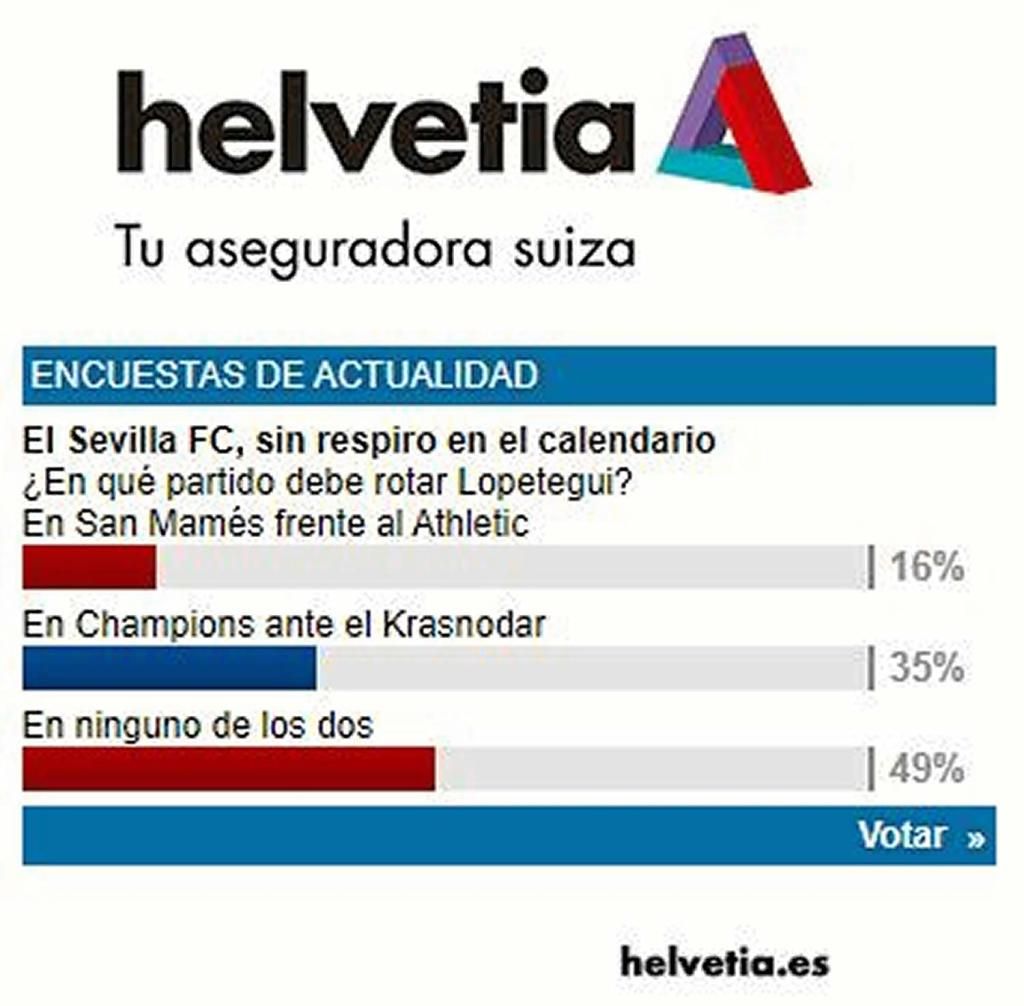 Una decisión importante para la que recibe un consejo por parte del sevillismo, partidario de que rote lo menos posible en los dos próximos partidos y si lo hace que sea en casa contra el Krasnodar. Es lo que se desprende de la encuesta realizada por ESTADIO sobre en qué partido debe rotar el vasco.