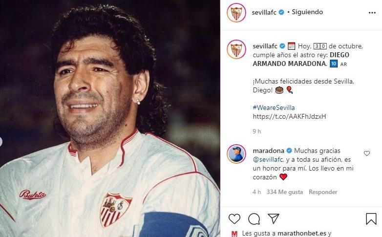 También en Instagram, donde el club sevillista ha publicado algunas fotos con la elástica nervionense y donde ha obtenido la respuesta del propio Maradona, agradecido por el detalle. "Muchas gracias Sevilla, y a toda su afición, es un honor para mí. Los llevo en mi corazón", ha escrito el argentino, acompañado de un corazón.