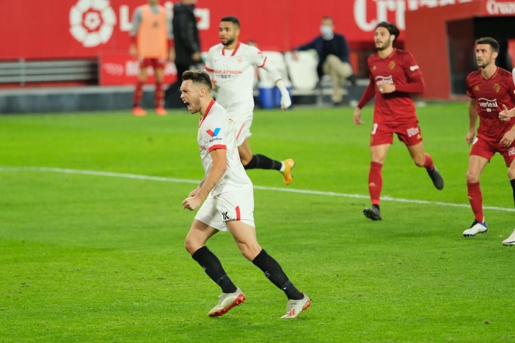 La segunda parte arrancó con la entrada de Rakitic por Navas, que dijo 'basta' tras jugarlo absolutamente todo desde hace meses y llevar varios partidos entre algodones. Un cambio de piezas obligado que llevó a Ocampos a ocupar todo el carril diestro, con Escudero en la izquierda, y a un nuevo dibujo táctico con tres centrales, incrustando a Fernando en el eje de la zaga. Podía ser el croata una buena solución para agarrar el balón y tratar de controlar un partido sin dueño. Y la mejoría, aunque leve, se notaba con aperturas a los costados y mayor producción de centros al área. Pero fue una jugada tonta la que abrió el partido. Un penalti tan absurdo como claro de Moncayola sobre Ocampos, que tomó la responsabilidad y vio cómo Sergio Herrera detenía su lanzamiento. El meta rojillo, sin embargo, se había adelantado y hubo que repetir la pena máxima. A la segunda sí, no falló el argentino, que engañó al meta y lo celebró con rabia.