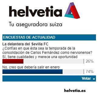 Asi lo ve en cierto modo la afición nervionense, o al menos, es la conclusión que se desprende de la encuesta realizada por ESTADIO acerca de si confía en que esta temporada sea la de la consolidación de Carlos Fernández en el Sevilla. Llama la atención que un alto porcentaje de los participantes, por encima del 70%, cree que debería salir en el mercado de enero, siempre y cuando supusiera la llegada de otro ariete, mientras que un 26% considera que tiene cualidades y que merece la oportunidad.