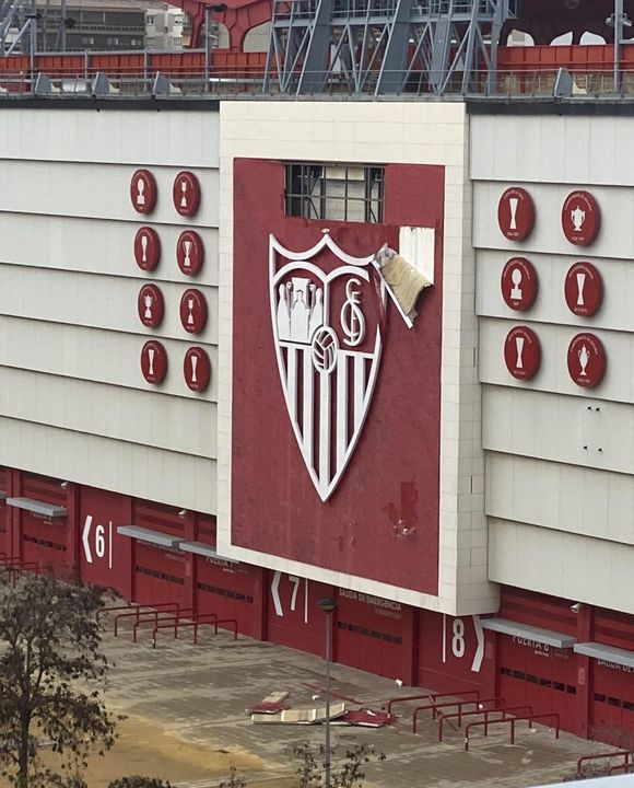 El temporal que está azotando estos últimos días a la ciudad de Sevilla con fuertes rachas de viento ha provocado que unos paneles de la fachada del Ramón Sánchez-Pizjuán se hayan desprendido en la tarde de hoy. Concretamente se tratan de la parte central de la grada de Gol Sur, donde está ubicado el mosaico con el escudo del Sevilla FC.