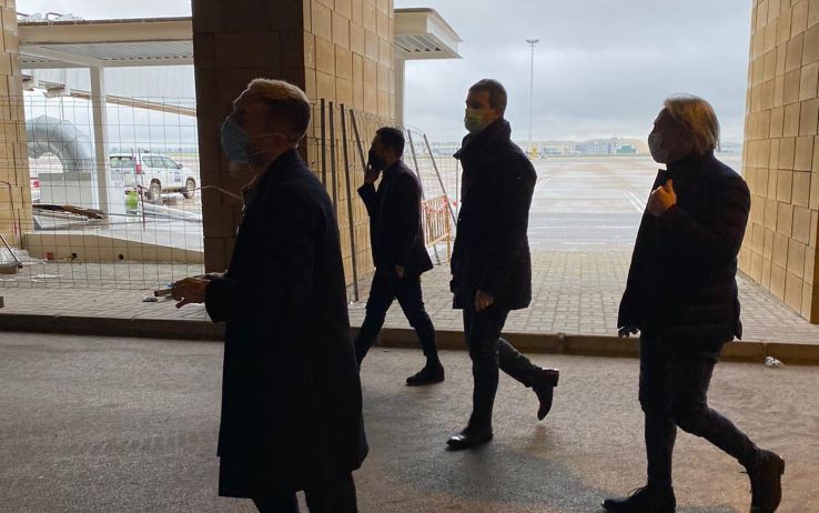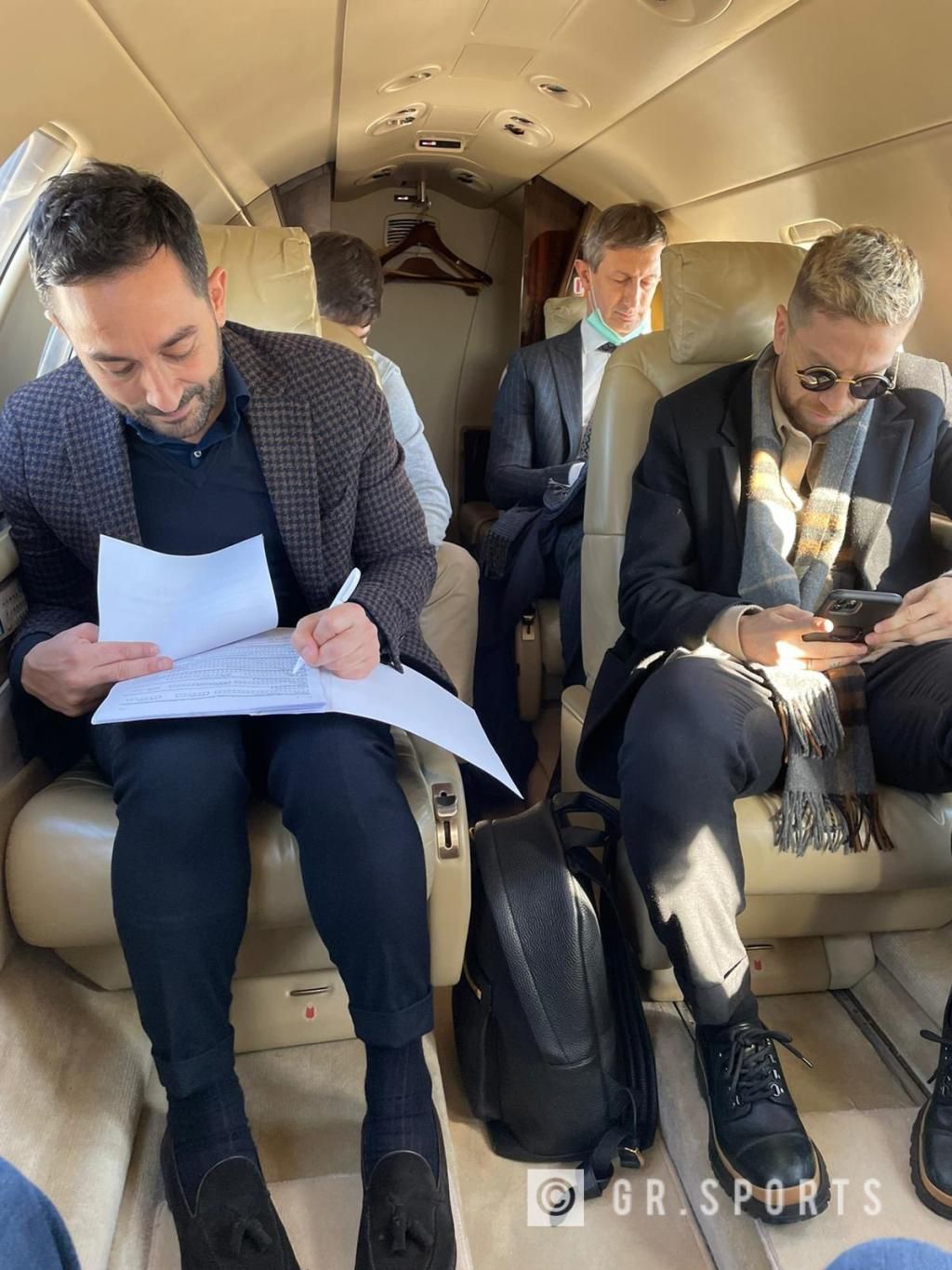 El Papu Gómez, en compañía de su agente Giuseppe Riso, ha aterrizado en el aeropuerto de San Pablo, donde ha sido recibido por el director general deportivo del Sevilla FC, Monchi.