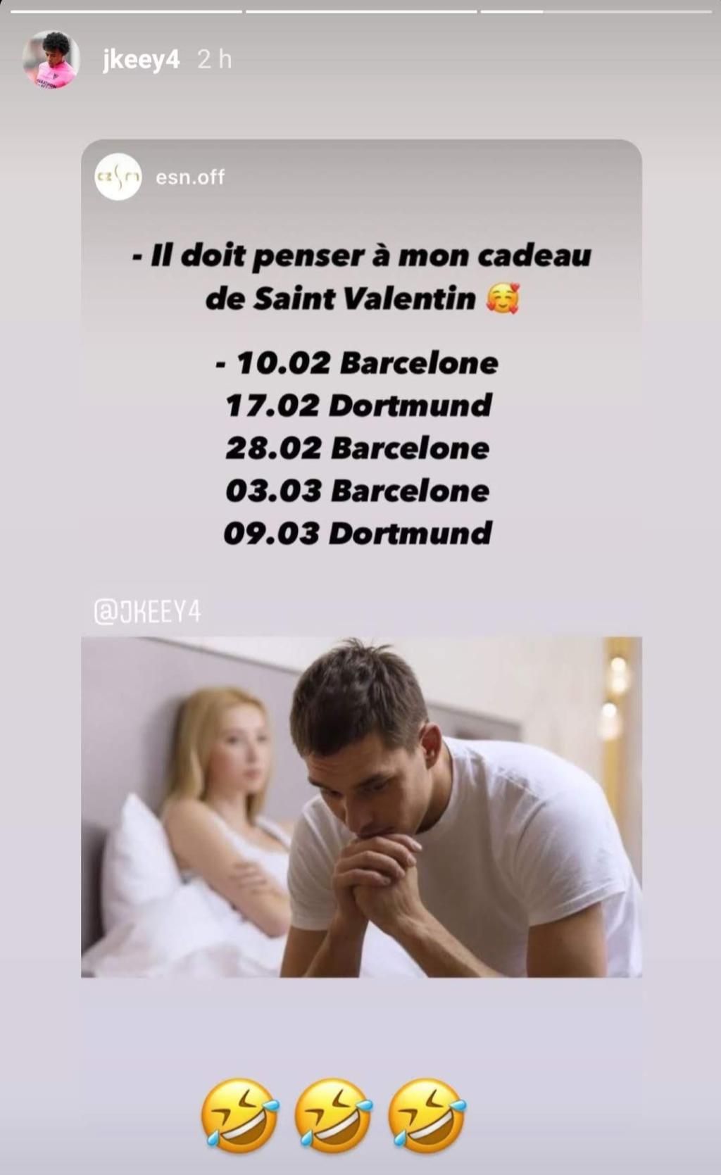 Koundé ha compartido un 'meme' en sus historias de Instagram que resume a la perfección lo único que se le pasa por la cabeza al jugador francés ahora mismo. En la parodia, se ve a un hombre reflexionando y a su pareja imaginando que está pensando en el regalo de San Valentín. Nada más lejos, el central francés bromea poniéndose en la piel del chico y descubre que en su mente sólo hay sitio para Haaland, Jadon Sancho, Messi y Griezmann.
