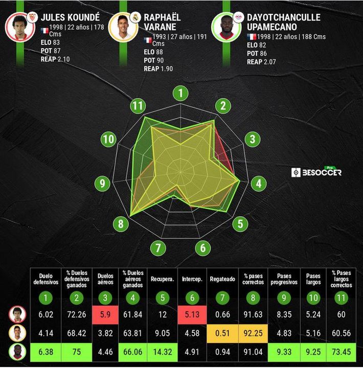 La partida más difícil para Koundé llega al ser comparado con Raphaël Varane y Dayot Upamecano. El madridista es un pilar en la zaga de Francia, con la que ganó el Mundial, y se erige en esta muestra como el zaguero que menos veces es regateado, mientras que el joven jugador del RB Leipzig, con la misma edad que Koundé, se presenta como el mejor defensa francés en lo que va de temporada y en su caso sí ha sido ya tres veces internacional absoluto.
