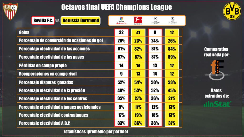 Los hispalenses tienen registros muy similares en ambas competiciones, dado que en los de Lopetegui prima la regularidad, ante todo, si bien en Champiosn mejoran en cuanto a su efectividad a balón parado, en la productividad de sus contraataques, en el resultado de su presión o en las recuperaciones en campo rival, tal y como muestra este gráfico elaborado por fiebreFútbol con datos de Instat.