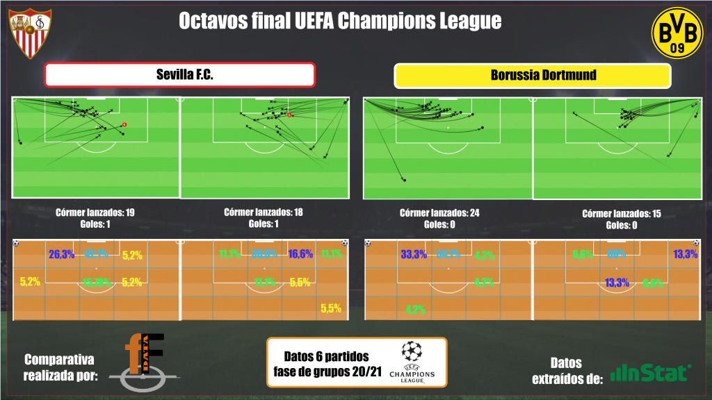 En cuanto a los saques de esquina, se aprecia, en este cuadro elaborado por fiebreFútbol con datos de Instat, que el Sevilla FC tiene una mayor variedad que los teutones, quienes generalmente los mandan al vértice del área pequeña del primer palo, con la idea de prolongar y, una vez agitadas las marcas, buscar el remate. Los de Terzic no son, sin embargo, especialmente fuertes por alto; todo lo contrario: su media es de 13,9 duelos aéreos ganados por partido (17º de la Bundesliga), mientras que los blanquirrojos se llevan por el aire 17,5 (8º de LaLiga en este registro).