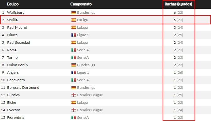 Y todo ello lleva a que el Sevilla FC sea el segundo que más choques lleva ganados de manera consecutiva. Es decir, números que, de mantenerlos -algo harto complicado, obviamente-, dejarían a este Sevilla FC como firme candidato al título de LaLiga. Por mucho que Lopetegui se niegue a hablar de ello. Y que siga sin hacerlo, porque así le va de maravilla...