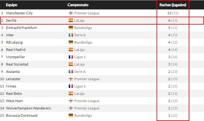 Sólo el Manchester City le sigue el ritmo a un Sevilla FC que, eso sí, han encajado un tanto menos que los de Pep Guardiola en sus últimos seis encuentros. De hecho, los blanquirrojos acumulan cinco de manera consecutiva sin recibir tanto alguno, registro únicamente superado en el Viejo Continente por el Wolfsburgo (6).