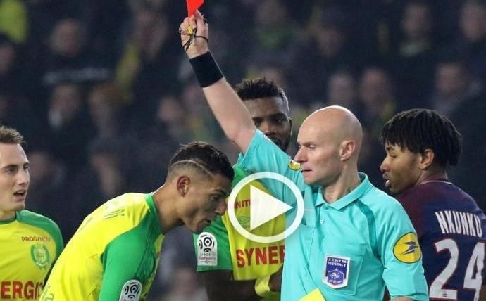 ¡Lo nunca visto! ¡El árbitro da una patada a un jugador del @FCNantes y a continuación lo expulsa! #beINLigue1 pic.twitter.com/LWN9Et2RTo