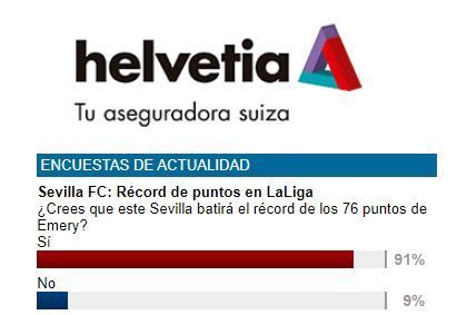 En la #EncuestaHelvetiaED propuesta durante todo este pasado jueves en www.estadiodeportivo.com, un 91 por ciento de los participantes consideró que el Sevilla FC de Lopetegui no tendrá problemas en superar los 76 puntos que logró el equipo dirigido por Emery en la 14/15, frente a un residual nueve por ciento que no lo tiene claro, a pesar de que le bastaría con sumar 10 de los 18 puntos que quedan en juego en estas seis últimas citas de LaLiga 20/21.