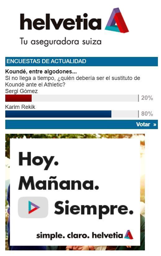 Así, en ESTADIO Deportivo lanzamos la pregunta de nuestra 'Encuesta Helvetia' en ese sentido. ¿Quién debería ser el sustituto de Koundé ante el Athletic? Y la afición ha respondido de forma tajante. Hasta un 80% preferiría ver titular a Rekik junto a Diego Carlos. El central holandés ha rendido cuando lo ha hecho en una posición que no es la suya natural, como lateral zurdo. En cambio, un 20% apostaría por Sergi Gómez, quien ha sido la primera opción de Lopetegui cuando no ha podido contar con la pareja Diego Carlos-Koundé.