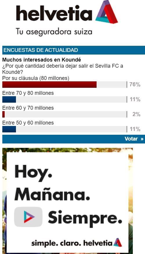 Así, en ESTADIO Deportivo hemos querido pulsar la opinión de la afición nervionense sobre el precio por el que el club sevillista debería dejar salir a Koundé. Para ello, ofrecimos diferentes opciones en nuestra 'Encuesta Helvetia', aunque una abrumadora mayoría lo tiene claro: la cláusula de 80 millones.