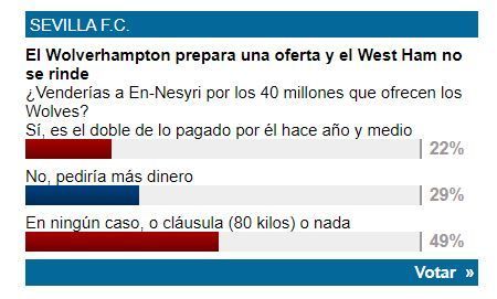 El consenso se completa con la opinión favorable de un sector del sevillismo. Preguntados por este periódico en la #EncuestaHelvetiaED, un mayoritario 49 por ciento se decantaba por negarse en rotundo y remitir al listado con a todo el que llegue preguntando por En-Nesyri.