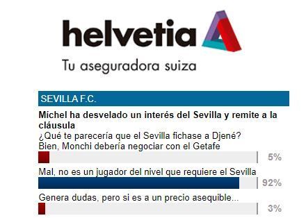 A tenor del contundente resultado que ofrece el resultado de la #EncuestaHelvetiaED, el sevillismo no ficharía a Djené ni con todas las facilidades posibles. No ya por los 40 millones de su cláusula, cifra del todo alocada e impensable en un club como el nervionense, sino tampoco por una cifra sensiblemente inferior. Es más, un elocuente 92 por ciento sentencia que no tiene nivel para vestir de blanquirrojo. Sólo un 8 por ciento aboga por negociar con los azulones a un precio coherente.