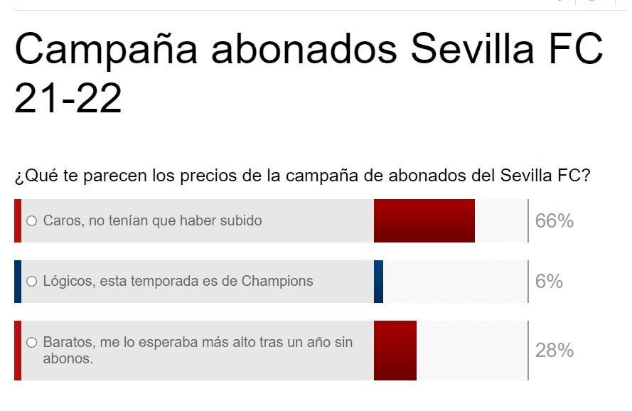 Los resultados fueron contundentes, puesto que un 66% de los votos emitidos afirman que son caros y no deberían haber subido, un 28% los ve baratos esperándoselos más altos y finamente sólo un 6% los ve lógicos en cuanto a coste por jugar la Champions League.