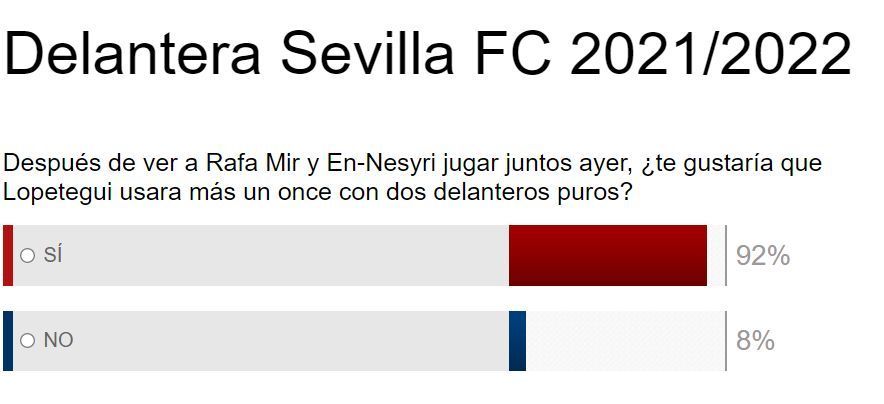 ESTADIO Deportivo, a través de su #EncuestaHelvetia, quiso pulsar la opinión del aficionado sevillista sobre si le gustaría ver más a su equipo con dos delanteros al mismo tiempo.
