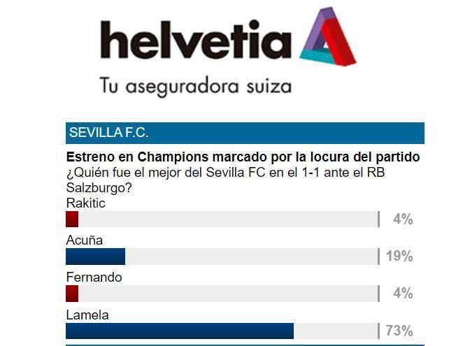Tan bien estuvo el argentino, que en la #EncuestaHelvetiaED propuesta por este periódico fue elegido, de largo, como el MVP del accidentado choque inaugural de la Champions. Lamela se llevó un aplastante 73 por ciento de los votos. El que más de cerca le siguió fue su compatriota Marcos Acuña, elegido por un 19 por ciento que valoró sus buenas asistencias desde la izquierda a pesar de que durante muchos minutos jugó como marcador zurdo para intentar frenar a Adeyemi. Con un 4 por ciento cada uno cierran el sondeo el siempre omnipresente Fernando Reges y el autor del tanto del empate, Ivan Rakitic.