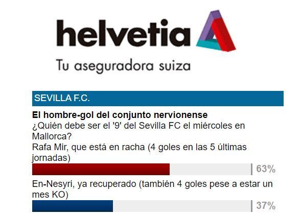Ante esta situación, ESTADIO ha pulsado la opinión del sevillismo para conocer sus preferencias para el ataque de Lopetegui en la visita del próximo miércoles al RCD Mallorca. Así, la #EncuestaHelvetiaED de ayer preguntaba por quién debe ser el '9' titular en tierras baleares. Rafa Mir, para no frenar su buena racha realizadora, o En-Nesyri, ya recuperado, con galones que se ha ganado sobradamente y necesitado de minutos para recuperar el ritmo tras estas cuatro semanas parado.