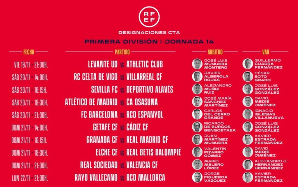 La Real Federación Española de Fútbol ha dado a conocer los árbitros que se encargarán de dirigir los partidos correspondientes a la jornada 14 de LaLiga que se disputan este fin de semana.