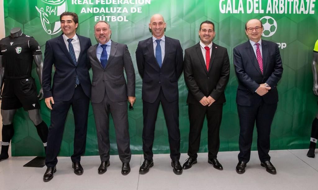 Ambos mandatarios arroparon al hispalense junto a sus homólogos de la Real Federación Española de Fútbol, Luis Rubiales, y de la Federación Andaluza, Pablo Lozano, en el Campus del Conocimiento de Dos Hermanas, la Gala del Arbitraje Andaluz.