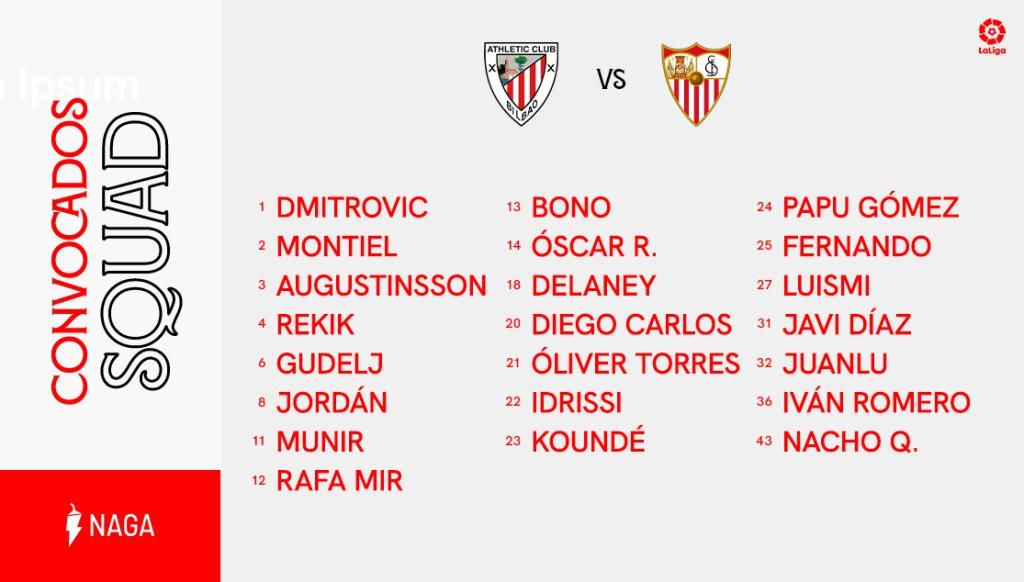 La lista completa la conforman: Bono, Dmitrovic, Javi Díaz, Montiel, Koundé, Diego Carlos, Rekik, Augustinsson, Gudelj, Fernando, Delaney, Joan Jordán, Óliver Torres, Luismi Cruz, Juanlu, Idrissi, Óscar Rodríguez, Papu Gómez, Nacho Quintana, Munir, Iván Romero y Rafa Mir.