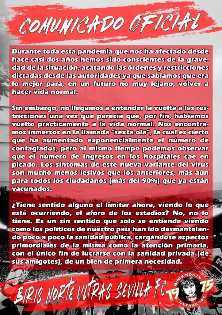 El conocido grupo del Sevilla FC, Biris Norte, ha lanzado un duro comunicado en el que protesta contra las medidas que limitan el aforo a los estadios de fútbol que se han tomado durante esta semana debido al avance de la pandemia del coronavirus.
