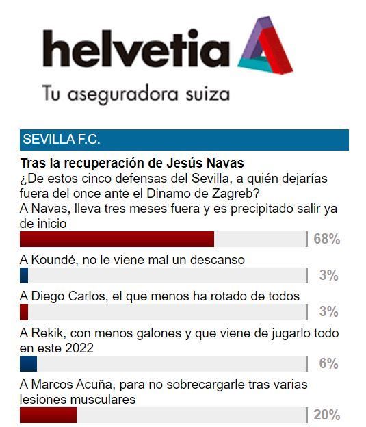 Un 68 por ciento de los votantes abogan por la suplencia del palaciego, lo que supondría repetir la línea que acabó el choque en El Sadar y disputó los 90 minutos en el triunfo del pasado viernes contra el Elche, con Koundé en el lateral derecho y Rekik como acompañante de Diego Carlos en el eje. Un nada despreciable 20% apuesta por dosificar al recién renovado Acuña y desplazar al polivalente zaguero neerlandés al lateral izquierdo. No obstante, cabe recordar que el argentino vio la quinta amarilla ante los ilicitanos y se perderá el choque de LaLiga ante el RCD Espanyol fijado para el próximo domingo.
