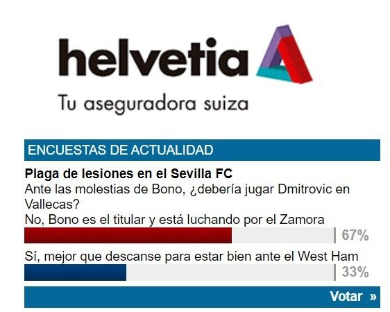 Tras las ultimas bajas sufridas, no está para arriesgar mucho, pero al menos para la afición, Bono debe estar de salida en un partido tan importante como el que tendrá lugar este domingo. Así lo manifiestan en la #EncuestaHelvetia, donde señalan que debe jugar, aunque sea forzando.