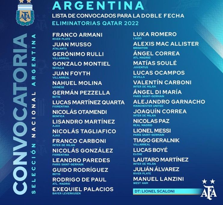 Por otro lado, destaca la vuelta de Messi y los siete juveniles que quiere empezar a ver junto a los 'grandes': Luka Romero (Lazio de Italia), Matías Soulé (Juventus de Italia), Franco y Valentín Carboni (Inter), Nicolás Paz (Real Madrid), Tiago Geralnik (Villarreal) y Alejandro Garnacho (Manchester United).