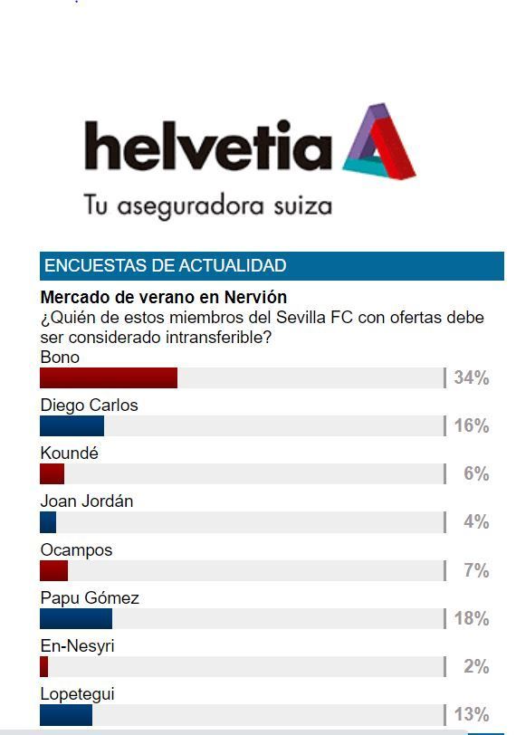 Si alguien tiene que salir el gran dilema es saber de quien desprenderse. Desde la portería a la delantera, Lopetegui tiene futbolistas que podrían encajar en cualquier equipo. Se da por hecho que a Koundé no se le podrá retener, aunque su principal destino -el Chelsea- no puede fichar. Y que En-Nesyri, con la temporada que lleva, tendrá menos ofertas de las esperadas. Y más bajas. Pero si alguien tiene la afición claro que hay que retener ése es Yassine Bono. Al menos así lo asegura en la #EncuestaHelvetia. El portero marroquí está ahora mismo ante el reto de ganar el primer Trofeo Zamora de la historia del Sevilla y de clasificar a Marruecos para el Mundial.