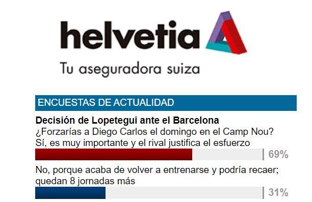Con todo estos condicionantes sobre la mesa, un mayoritario 69 por ciento de los participantes en la #EncuestaHelvetiaED se han mostrado partidarios de adelantar el regreso de Diego Carlos a la titularidad, primando la entidad del rival, el momento de forma en el que está y la importancia del encuentro antes que el objetivo riesgo de dar un paso atrás en su puesta a punto después de un mes apartado de las alineaciones tras forzar en el derbi liguero, opción remarcada por un considerable 31 por ciento de los votantantes.