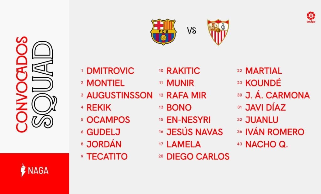 La lista completa de 23 jugadores con la que el Sevilla FC intentará salir del Camp Nou segundo en LaLiga la conforman: Bono, Dmitrovic, Javi Díaz, Jesús Navas, Montiel, Koundé, Diego Carlos, Rekik, José Ángel, Augustinsson, Gudelj, Juanlu, Joan Jordán, Rakitic, Nacho Quintana, Ocampos, Tecatito, Lamela, Munir, Martial, Rafa Mir, En-Nesyri e Iván Romero.