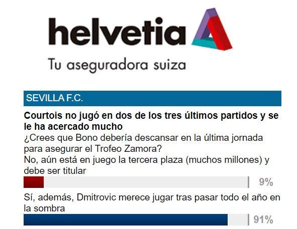 Si Bono no juega el domingo ante el Athletic, gana el Trofeo Zamora. Aunque Courtois deje su portería a cero ante el Betis, ya no podría alcanzarle. Es así de simple. Tan sencillo, que en la #EncuestaHelvetiaED propuesta por este periódico se ha vivido uno de los resultados más aplastantes en mucho tiempo. Un 91 por ciento de los participantes en el sondeo ve evidente que el marroquí no debe jugar ser alineado por Julen Lopetegui en la última jornada de LaLiga 21/22. El Sevilla FC ya tiene asegurada su plaza de Champions y Marko Dmitrovic es un portero de garantías que sólo suma ocho encuentros este curso y merece tener su momento.
