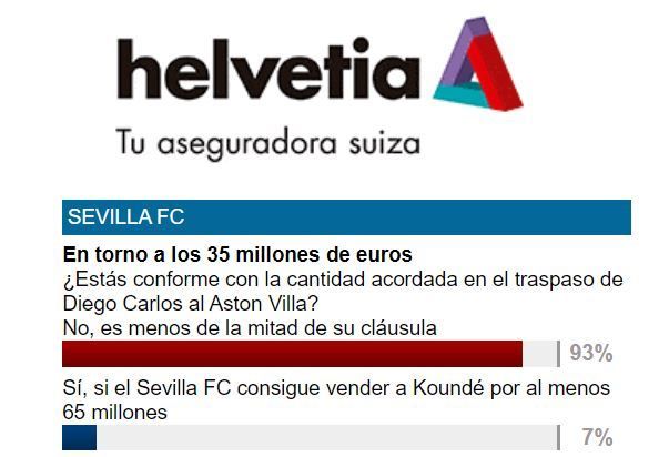 En la #EncuestaHelvetiaED propuesta hace dos días por este periódico, un mayoritario 93 por ciento se mostraban en desacuerdo con vender a Diego Carlos al Aston Villa por unos 35 millones de euros más variables. Sólo un 7 por ciento consideraban aceptable esta 'rebaja' siempre que sirva para apretar las tuercas al Chelsea por Jules Koundé.